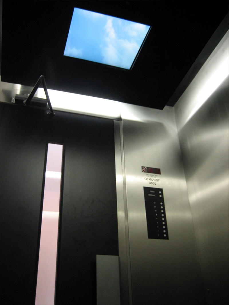 A video monitor is embedded in the ceilings of each series of 6 lifts contained in the buildings. These are linked via the Internet to a camera placed in an international city, filming the sky 24 hours a day, seven days a week and broadcast live. Every year for 6 years a camera will capture the sky of a different city: Santiago in Chile, Hanoi, Quebec City, Tangier, Bucharest, Kinshasa.