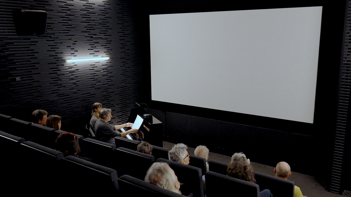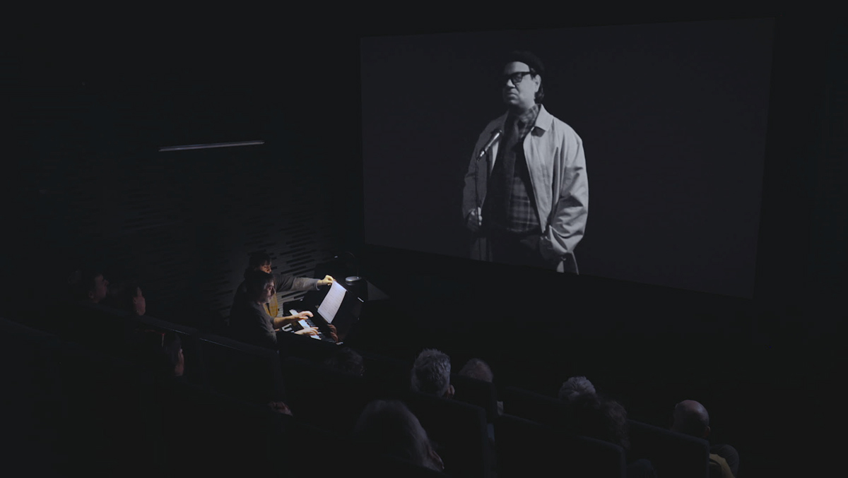 The film Ghosts and piano is constructed around a selection of nine of these voices, one following another. The voices are those of Arnold Schönberg, Nina Simone, Morton Feldman, Setsuko Hara, Cecil Taylor, Billie Holiday, Orson Welles, Pier Paolo Pasolini, and Anna Magnani. For the film, the voices will be embodied via artificial intelligence. We are thus witness to a casting where each character comes to speak at the microphone facing the camera. This parade is for the most part heterogeneous, with certain among the cast having rubbed shoulders during their lifetime, while others come from very different backgrounds, creative fields, and eras. All of these celebrities were gone by the time the film was made, but they are reborn before our very eyes as ghosts from a memory, sometimes forgotten, unexpectedly revived by the magic of a kind of Méliès cinema. This silent film is screened in black and white, accompanied by an upright piano. The film’s first screening was filmed in the space dedicated to silent cinema at the Royal Film Archive of Belgium in Brussels. The final film is in color with sound, but the fixed frame and real-time shooting are reminiscent of the workers leaving the Lumière factory, a film first shown in 1895. And so Georges Méliès, like Auguste and Louis Lumière, searched for talking pictures.